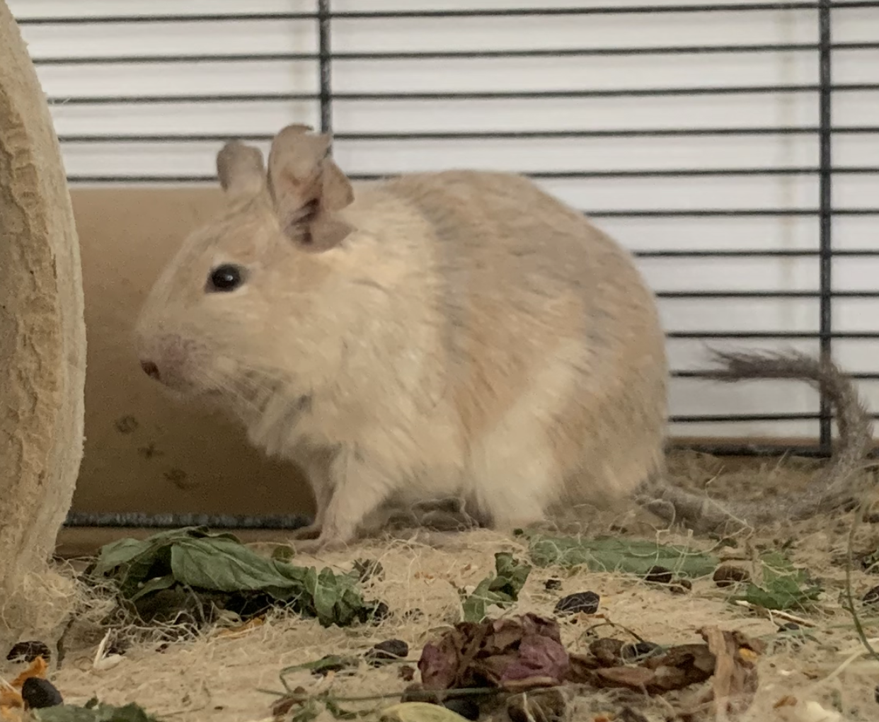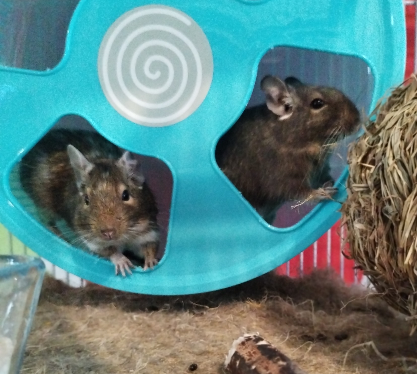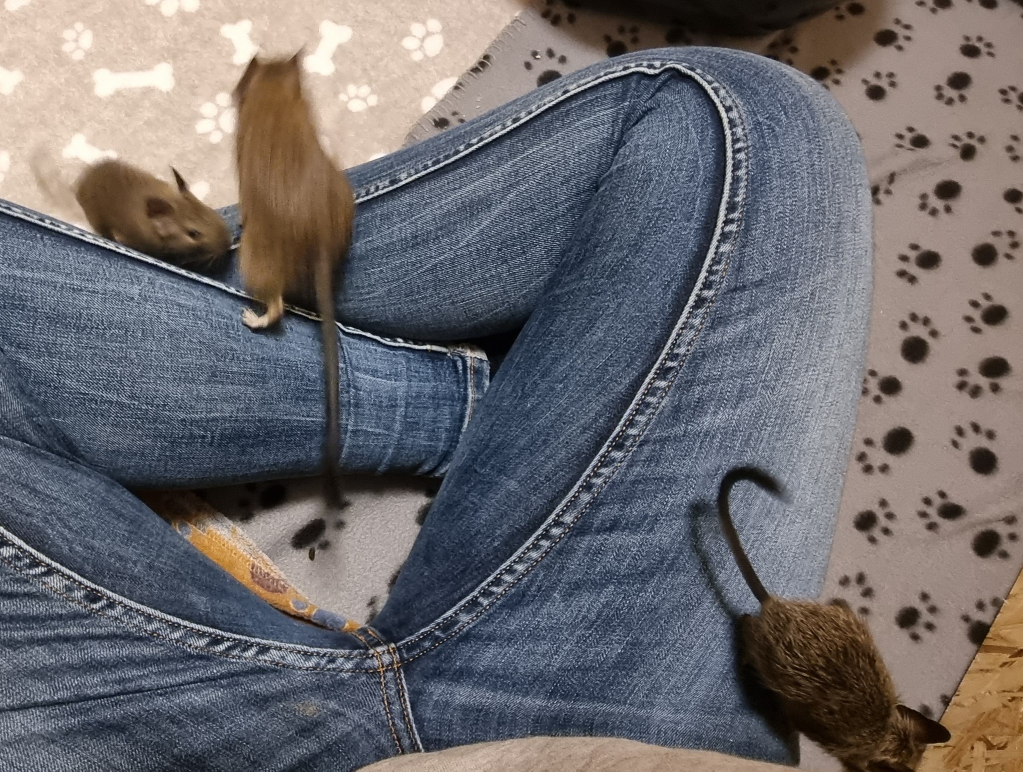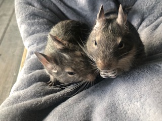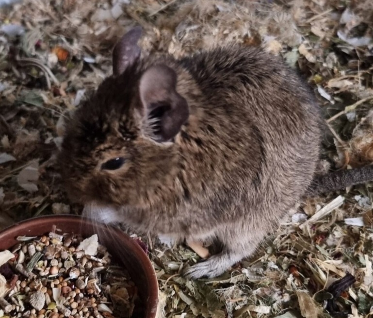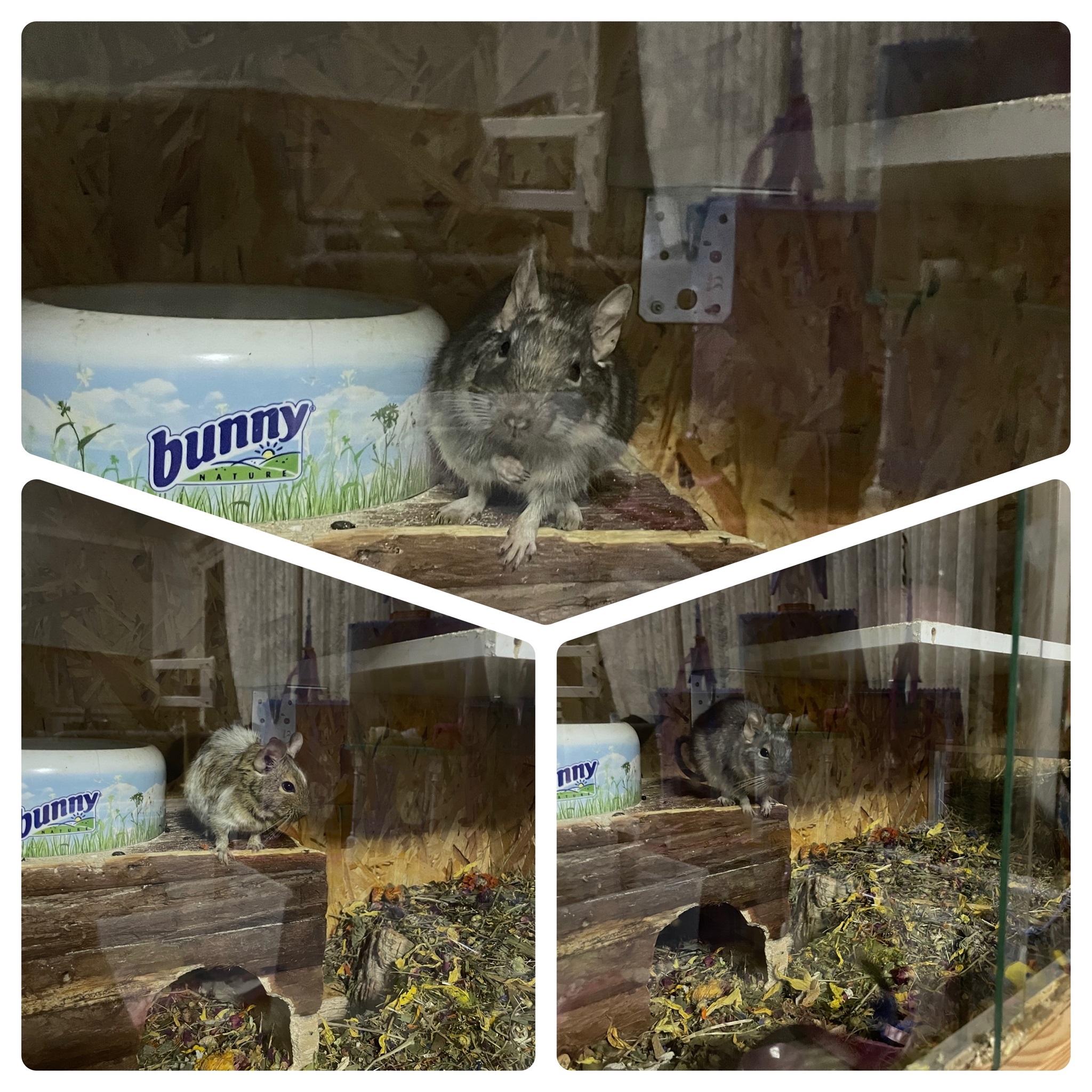 Ich muss Mipsi nun von den beiden Männchen trennen und es bricht mir das Herz, da Degus - wie viele andere Nager auch - Rudeltiere sind. Wir geben sie auch auf keinen Fall in Einzelhaltung ab. Idealerweise findet sie ganz schnell ein neues Rudel, da eine Degu-Vergesellschaftung ab einem Alter von 6 Monaten ziemlich schwierig werden kann. Unser Verein gibt jeden Degu nur gegen eine Schutzgebühr von 20,- € ab.